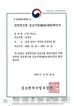 | 경영혁신형 중소기업(Main-Biz)인증 | 210305-02963 | 21.12.22 |